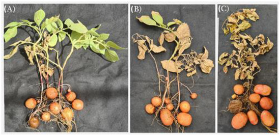 Potato plants carrying G2 tubers: the commercial cultivar Lady Rosetta (A), M-D clone (B) and Ros 119 clone (C).