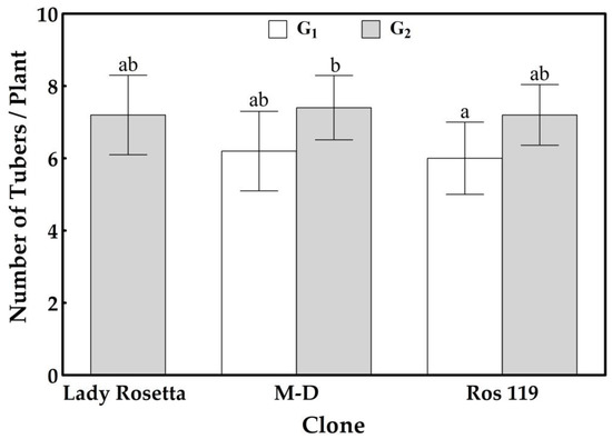 Number of tubers formed by the commercial cultivar Lady Rosetta, M-D clone and Ros 119 clone. Values are presented as mean ± SD of five replicates; bars with different letters are significantly different, based on the LSD test, at p < 0.05.