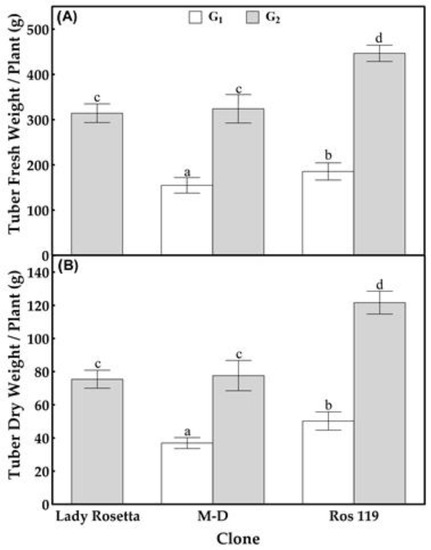 Fresh (A) and dry (B) weights of tubers formed by the commercial cultivar Lady Rosetta, M-D clone and Ros 119 clone. Values are presented as mean ± SD of five replicates; bars with different letters are significantly different, based on the LSD test, at p < 0.05.