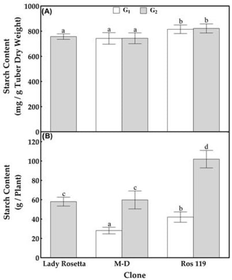 Tuber starch content on dry-weight (A) and per-plant (B) bases in tubers formed by the commercial cultivar Lady Rosetta, M-D clone and Ros 119 clone. Values are presented as mean ± SD of five replicates; bars with different letters are significantly different, based on the LSD test, at p < 0.05.