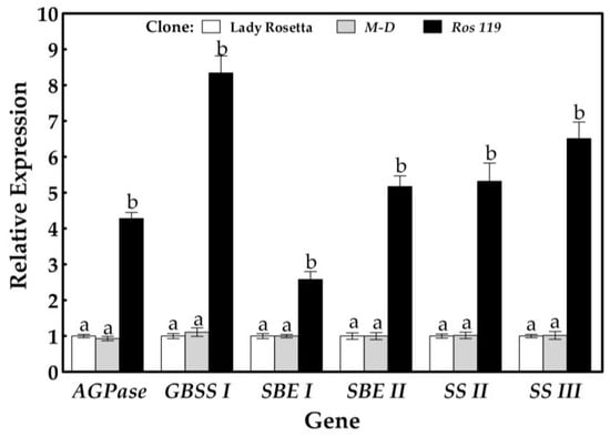 Relative expressions of starch-synthesis-related genes in tubers formed by the commercial cultivar Lady Rosetta, M-D clone and Ros 119 clone. Values are presented as mean ± SD of five replicates; bars with different letters are significantly different, based on the LSD test, at p < 0.05.