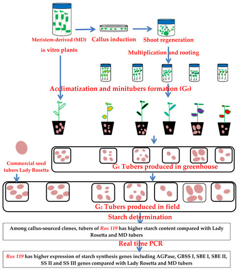 Therefore, the aim of the present investigation is to exploit somaclonal variation in callus-sourced regenerated plants in order to select new potato lines with a high starch content and to elucidate the gene expression profiles of starch-related genes, namely, AGPase, GBSS I, SBE I, SBE II, SS II and SS III.
