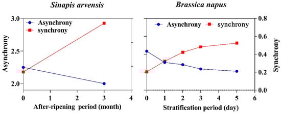 The changes in synchrony and asynchrony patterns in response to after-ripening and stratification periods.