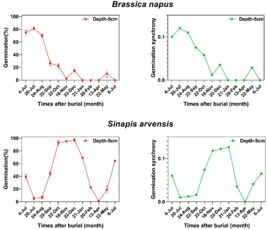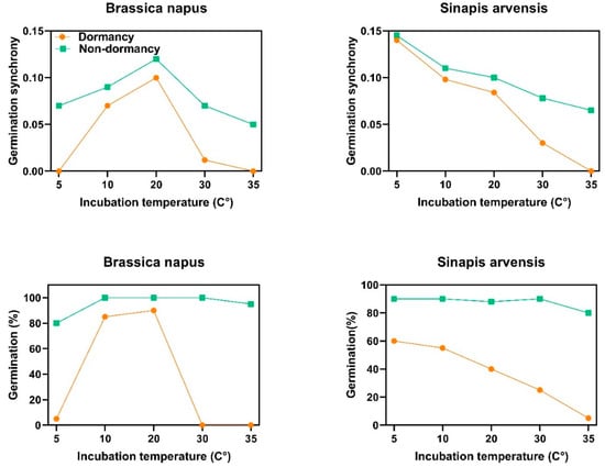 Germination behavior and synchrony patterns of two species of Brassicaceae family at different incubation temperatures. Brassica napus and Sinapis arvensis have type 3 and 1 non-deep physiological dormancy, respectively. To obtain nondormant seeds, after-ripening was applied as a dormancy-breaking agent.