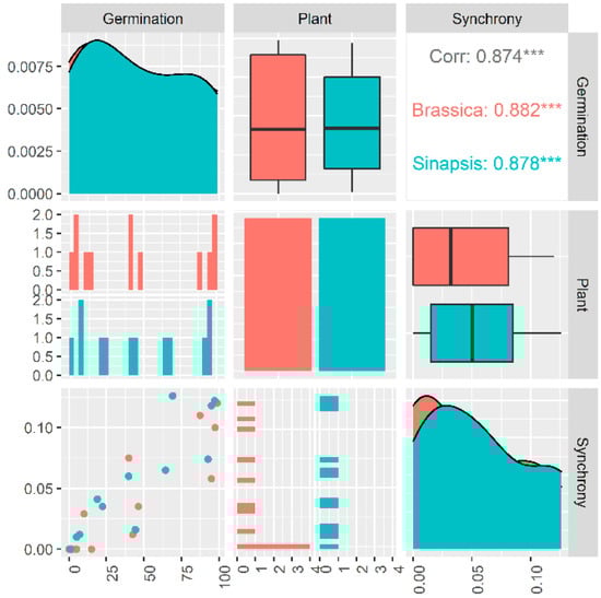 The relationship between germination and germination synchrony of two species belonging to Brassicaceae family. The boxplots, density plots and scatter plot between these traits are indicated. Spearman correlation was used to obtain the boxplots, density plots and scatter plot between these traits. Spearman’s rank correlation coefficient was estimated using Spearman correlation method. *** indicates significance level.