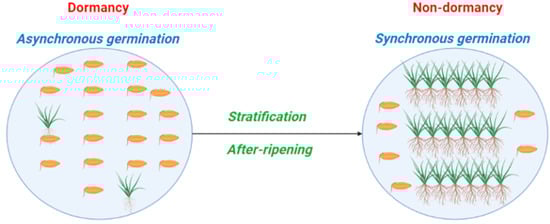 From 1950 onwards, the term after-ripening has been widely used to describe dormancy break during dry storage of seeds [26]. Many researchers have indicated that a period of dry storage at ambient temperature can terminate seed dormancy [30,31,32]. Although much attention has been given to this method, still, more research is required for understanding the underlying mechanisms of this method. Furthermore, after-ripening requirements may be specific to species, and a long duration of after-ripening may act as dormancy-inductive agent, leading to secondary dormancy [26].