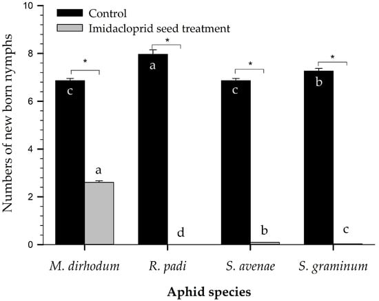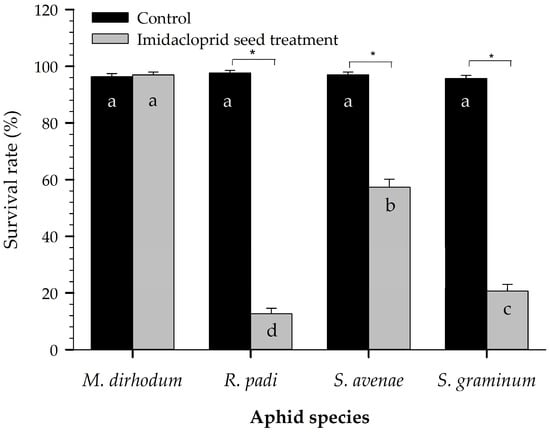 Survival of four wheat aphid species 5 d after they infected wheat on the thirtieth day after germination. “*” above the two bars for a given aphid species indicates that the difference between the control and treatment was significant (p < 0.05). The same letters on the control bars indicate that there were no significant differences by paired bootstrap test. Bars showing means of imidacloprid seed treatments with different letters indicate significant differences by paired bootstrap test.