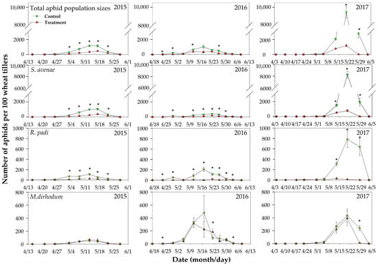 From the reviving period, surveys in the treated and control plots were conducted approximately weekly beginning on 15 April 2015, 17 April 2016, and 4 April 2017 and continuing until the middle maturity stage. Ten samplings were conducted uniformly in each plot. On each sampling day, the numbers of winged and wingless individuals of different species, including R. padi, S. avenae, and M. dirhodum, were counted by visually searching 100 tillers of each sampling in six plots when the aphid density was less than 200 aphids per 100 tillers and searching 20 tillers of each sampling in six plots when the aphid density was more than 200 aphids per 100 tillers [17,32]. When it was raining or when crops were being irrigated, the sampling was done in advance or postponed by about 1~2 days.