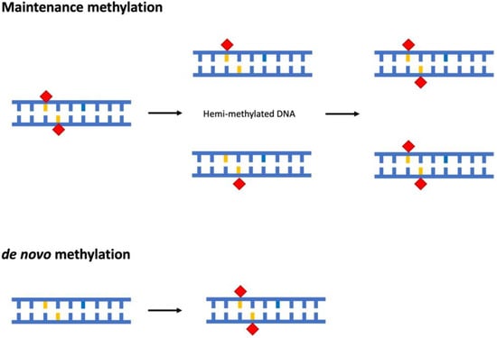 Schematic representation of maintenance and de novo methylation of DNA. The methyl group is indicated by red rhombus, whereas cytosine is indicated in orange.