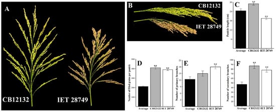 Two new genotypes, i.e., CB12132 and IET 28749, identified for the high number of filled grains per panicle and superior panicle characteristics. (A–B) panicle morphology of CB12132 and IET 28749. (C–F) Comparison of panicle length, number of spikelets per panicle, number of filled grains per panicle, number of primary branches, and number of secondary branches in CB12132 and IET 28749 with the average value of 50 germplasm over two seasons. Error bar shows standard error (n = 10); ** indicate 1% significant difference from average compared to the Student’s t-test.