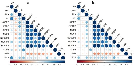 Among the traits studied, the NOSPP and the NFGPP exhibited maximum phenotypic and genotypic coefficient of variation, thus ensuring their significance in utilization for grain yield improvement breeding programs [36,37]. The magnitude of the difference between GCV and PCV shows the amount of environmental influence on these traits, and the low difference refers to the occurrence of strong genetic effects [38,39]. The results showed that high GCV was obtained for 11 traits except for LOPB, FLA, and PL due to increased genetic variation, and improving these traits could be more effective. Similarly, previous reports also showed high-to-moderate GCV and PCV for NPT, NFGPP, TGW, and GYP [36,40]. Genetic advance coupled with high heritability is a more reliable measure for determining the usefulness of selection on the traits. Related to our study, high h2 and GASM combination was observed for the major traits, viz., PH, NFGPP, NOPB, NOSB, TGW, and GYP [37,41,42], and thereby allowed for selection in segregating generations in conventional recombination breeding methods.