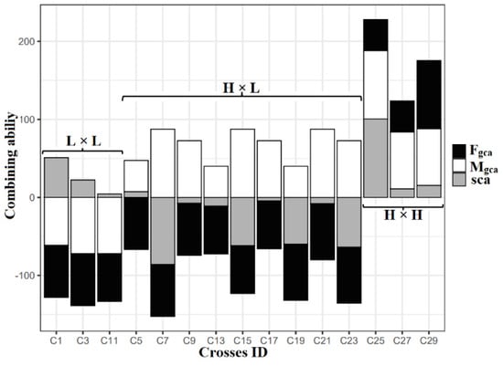 Comparison of the relationship between parental GCA and F1’s SCA on the number of filled grains per panicle for 15 direct crosses. Fgca, GCA effect of the female parent; Mgca, GCA effect of the male parent; SCA, SCA effect of F1s; L, low GCA; H, high GCA.