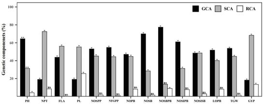 GCA and SCA variance exhibited the influence of additive and dominant gene action. The GCA/SCA variance for the number of productive tillers, panicle length, and grain yield per plant was recorded as lower than one and showed the presence of high non-additive gene action in those traits. Most of the panicle-related traits and plant height had a GCA/SCA variance greater than one, indicating the presence of high additive gene action (Table 6). The higher proportion of RCA variance was found in panicle length (25.584%), length of secondary branches (16.360%), and grain yield per plant (13.438%). The higher GCA variance was present in the number of secondary branches per primary branch (77.392%). A higher proportion of SCA variance was present in the number of productive tillers (87.316%), grain yield per plant (63.392%), and flag leaf area (55.84%) (Figure 6).