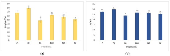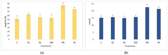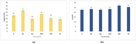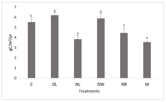 A few years after the establishment of the plots, during the drier periods, the withdrawal (NR and NI) treatments showed the highest CO2 emissions (Figure 1). This was because the vegetation (trees, shrubs) was cut in the plots of these treatments. Many fresh organic plant remains (mainly root remains of various sizes) remained in the soils. The decomposition of these remains increased the rate of soil respiration. In the first few years, especially during the drier periods, the effect of this process was evident, because due to the lack of living vegetation, the amount of evapotranspiration on the NR and NI plots was much lower, and transpiration practically ceased on these plots and the litter cover in the NR plot prevented evaporation from the soil surface. Soil moisture decreased among treatments in the following order: NR (33.5%), NI (30%), DW (24.8%), C (24.1%), DL (23.7%), and NL (22%) [,]. Thus, the soil moisture of these significantly exceeded the values measured for the soils of the other treatments, and the breakdown of the roots in the soil was more intense in the wetter soils (Figure 1).