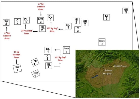 The Síkfőkút DIRT Project research area is located in the southern, hilly landscape of Bükk, belonging to the Northern Central Mountains, northeast of Eger (Hungary) (Figure 8). Geographical coordinates of the project: 47°55′34″ N and 20°26′29″ E, altitude 320–340 m. According to the soil survey [], the soils are Chromic Protovertic Luvisols (Clayic, Cutanic) and Protovertic Endostagnic Abruptic Luvisols (Clayic, Cutanic) []. The 27-hectare protected forest area is now under the supervision of the Bükki National Park. This research area is covered by the average 110-year Quercetum petraeae-cerris association with Quercus petraea and Quercus cerris species in the tree layer. The litter (organic matter) manipulation experimental plots were established in 2000 as part of the USA ILTER (International Long-Term Ecological Research) DIRT (Detritus Input and Removal Treatments) project. The DIRT plots in Síkfőkút were established according to the methods used in the USA DIRT Project []. In the case of the six treatments, three parallel plots were established, so a total of 6 × 3 = 18 experimental plots of 7 × 7 m (49 m2) were set up (Table 2).