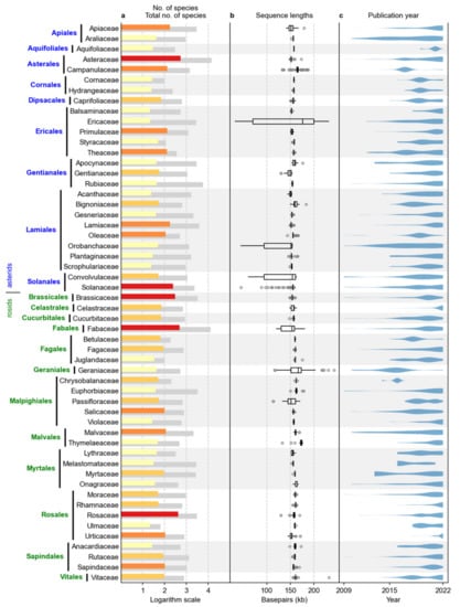 Number of RefSeq complete chloroplast sequences, distribution of sequence lengths, and publication years for the families of asterids and rosids containing 20 or more sequences. (a) Number of species according to NCBI taxonomy (gray bar) and number of available RefSeq chloroplast sequences (colored bar), where yellow represents 20–49, light orange 50–99, dark orange 100–199 and red ≥200 species. (b) Box plots of sequence lengths. (c) Violin plots of the number of published sequences by year.