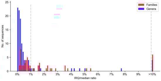 The histograms of the resulting IQR/median values for the records of genera and families are shown in Figure 2. In the case of families, 30 records (55.56%) have an IQR/median value of less than 1%; this proportion is less than 5.5% in all (88.89%) except six families (11.11%). The distributions of the genera are generally narrower. As seen in the histogram, 64 of the genus records (59.26%) have an IQR/median of less than 0.3%, and 94 of the records (87.04%) have a ratio value of less than 1%. The rest of the genus groups (12.96%) have ratios greater than 1%. The results show that the distributions become narrower and have fewer outliers when lower taxonomic rank (i.e., genus) is used, which is to be expected.