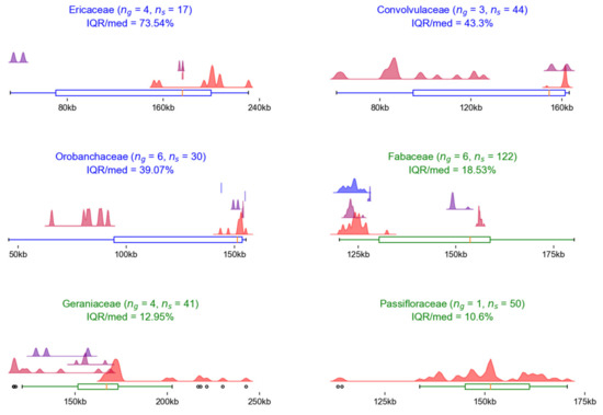 Three of the six families with the widest chloroplast genome length distributions were those for which loss of inverted repeats (IR) was reported in some taxa: Ericaceae [29,30], Fabaceae [31,32], and Geraniaceae [15,33].