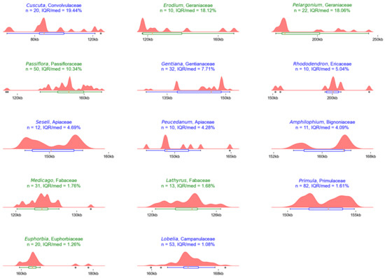 For all genera showing a wide distribution of sequence lengths, some specific reasons for the variation in chloroplast genome length have been previously reported (Table 3). These reasons were the following: parasitic life form (e.g., Cuscuta), IR loss (e.g., Erodium, Lathyrus, Medicago, Rhododendron), IR expansions and contractions (e.g., Passiflora, Pelargonium), and polyphyly (e.g., Amphilophium, Gentiana, Euphorbia, Lobelia, Peucedanum, Primula, Seseli). The parasitic genus Cuscuta had the widest distribution of chloroplast genome length, ranging from 60 to 125 kbp. The results showed that three Cuscuta species (C. exaltata, C. japonica, and C. reflexa) with the longest sequences were hemiparasitic and belonged to the same paraphyletic group [35]. For the remaining genera, it is noteworthy that the IR changes seem to affect the distribution of sequence lengths more than the reported polyphyly of the genera in question. In addition, it is expected that the resolution of generic polyphyly will lead to the creation of new genera whose distribution will be much narrower.