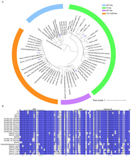 - Liu, Y.Y.; Yang, K.Z.; Wei, X.X.; Wang, X.Q. Revisiting the phosphatidylethanolamine-binding protein (PEBP) gene family reveals cryptic FLOWERING LOCUS T gene homologs in gymnosperms and sheds new light on functional evolution. New Phytol. 2016, 212, 730–744. [Google Scholar] [CrossRef] [PubMed]