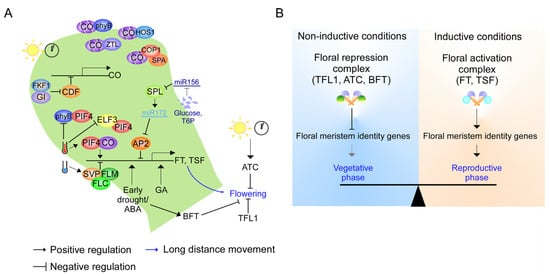 - Ryu, J.Y.; Lee, H.-J.; Seo, P.J.; Jung, J.-H.; Ahn, J.H.; Park, C.-M. The Arabidopsis Floral Repressor BFT Delays Flowering by Competing with FT for FD Binding under High Salinity. Mol. Plant 2014, 7, 377–387. [Google Scholar] [CrossRef]