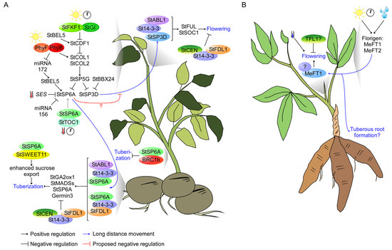 - Further in-depth studies of the molecular mechanism that controls the function of PEBP are needed. For example, the non-cell-autonomous function of FT requires an interaction with the MCTP transporter and phospholipids [24,46,55,56,133]. However, the mechanism underlying the long-distance transport of FT-like proteins in tubers and tuberous root crops is still elusive. Therefore, further verification of protein transporters and phospholipid interactors of the PEBP family from tubers and tuberous root crops is needed for a complete understanding of the PEBP signaling network in these plants. Furthermore, although StSP5G is a central regulator connecting the photoperiod with floral initiation and tuber formation by regulating StSP3D and StSP6A [21,29,109], it is not clear how StSP5G regulates its downstream targets. StSP5G may interact with other proteins, including St14-3-3s and StTCPs, to modulate floral initiation and tuber formation. Therefore, translating the knowledge from Arabidopsis could accelerate the characterization of the regulatory module of the PEBP-gene family in tubers and tuberous root crops (Figure 2);