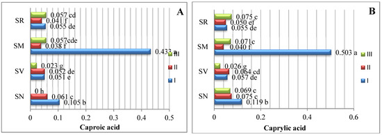 The analysis of our results indicates that the ripening stage and species do not influence variations in the caproic, caprylic, capric, undecylic, lauric, and margaric acids. Spyridon et al. 2020 [17] identified lower amounts of these acids in their research. Depending on the species, the contents of caproic acid varied from 0.028 to 0.073%, caprylic acid from 0.021 to 0.060%, and capric acid from 0.016 to 0.043%. A myristic acid content (0.034%) was found to be established in S. villosum fruits in ripening stage III, but this was not detected in S. nigrum, S. retroflexum, or S. melanocerasum fruits.