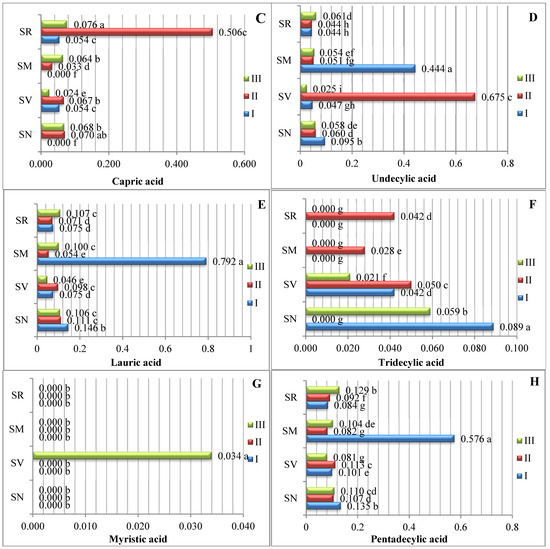 Our results show that the myristoleic acid and pentadecanoic acid contents ranged from 0.251% to 1.224% and 0.064% to 1.354%, respectively (Figure 2). We determined that the S. melanocerasum species had significantly higher levels of both acids in ripening stage I. In their study of tomato seeds, A. Demirbas [19] found 0.2% myristoleic acid. During the ripening period, the S. melanocerasum species had a significantly higher contents of gondoic (16.397%) and erucic (11.133%) acids in ripening stage I.