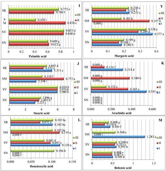 Amounts of saturated fatty acids in Solanum spp. fruit, %, in different ripening stages. Note: Percentages followed by different letters are statistically different (p < 0.05); S. retroflexum–(SR), S. melanocerasum–(SM), S. nigrum–(SN), S. villosum–(SV); ripening stages I, II, III.