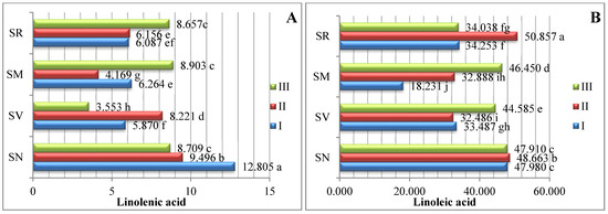 Linolenic acid was the second most predominant polyunsaturated fatty acid; the linolenic acid amounts varied from 3.553% to 12.805% in the analyzed fruits harvested three times throughout the growing season. The S. nigrum samples harvested in ripening stage I had the highest linolenic acid content (12.805%). A similar amount of linolenic fatty acid was found in the study of Spyridon et al. [17], where the content of linolenic acid in tomato fruit during the ripening stages was established to range from 5.52% to 8.02%. In their research, J. Kulaitienė et al. [20] determined the effect of ripening stages on the quality and quantity of fatty acids in the seeds of two rosehip species and two cultivars. Linolenic acid was found to be the second most abundant fatty acid, with contents ranging from 19.305% to 30.645% at the full ripening stage.