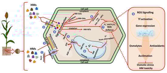 Schematic representation of plants’ response to heavy metals and induced osmotic stress. Plants growing in HM-contaminated soils can prevent HM uptake by (1) releasing root exudates that form insoluble complexes with metal ions, and (2) reduction of metal influx across the plasma membrane. Metal ions influx can still occur through the Ca2+ channels and the plasma membrane into the plant cell (3), MAPK-mediated signal transduction (4), occurs to induce the expression of metal chelating ligands in the cytosol to form complexes such as HM-AAs (amino acids), HM-OAs (organic acids), HM-MTs (metallothioneins) and HM-PCs (phytochelatins). HM-PC complexes are transported through the tonoplast into the vacuole by ATP-binding-cassette and V-ATPase transporter (5), which are further complex with sulfides from the chloroplast for degradation (6). The perception of HMs is amplified by the signalling transduction to induce ROS defence and oxidative stress (7), this leads to the activation of antioxidants (8) and (9) to combat oxidative damage, osmotic stress, and HM toxicity.