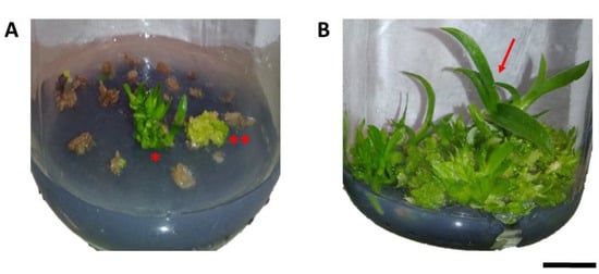 Effects of colchicine on in vitro protocorm survival of Blc. Haw Yuan Beauty × Blc. Goldenzelle “LC”: (A) protocorms cultured in MS medium for 120 days after treatment with colchicine at a concentration of 1000 μM and exposure time of 24 h, showing dead tissues, regeneration of PLBs ** and plantlets *; (B) control treatment with protocorms in plant regeneration (red arrow). Scale bar = 1 cm.