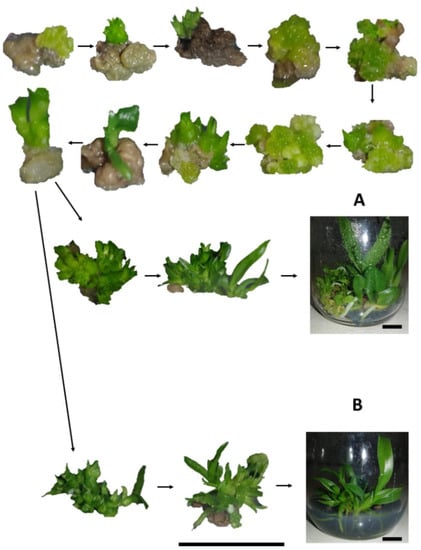Regeneration of progeny of Blc. Haw Yuan Beauty × Blc. Goldenzelle “LC” in response to colchicine treatment of protocorms: (A) plantlets regenerated from protocorms treated with colchicine; (B) plantlets regenerated from protocorms not treated with colchicine. Scale bar = 1 cm.