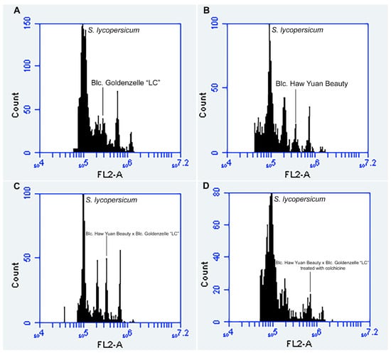 Flow cytometry histograms with nuclear 2C value measurements using the internal standard S. lycopersicum (2C = 2.00 pg): (A) male parent Blc. Goldenzelle “LC” with 2C = 5.79 pg; (B) female parent Blc. Haw Yuan Beauty with 2C = 7.79 pg; (C) Blc. Haw Yuan Beauty × Blc. Goldenzelle “LC” not treated with colchicine with 2C = 6.86 pg; (D) Blc. Haw Yuan Beauty × Blc. Goldenzelle “LC” treated with colchicine with 2C = 14.37 pg.