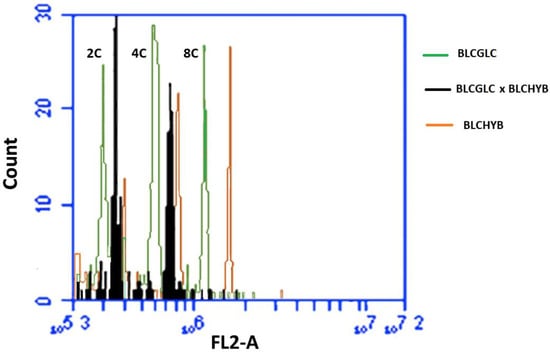Comparison of the 2C, 4C and 8C peaks channels between Blc. Haw Yuan Beauty (BLCHYB) (orange line), Blc. Goldenzelle “LC” (BLCGLC) (green line) and the progeny of Blc. Haw Yuan Beauty × Blc. Goldenzelle “LC” not treated with colchicine (black line).