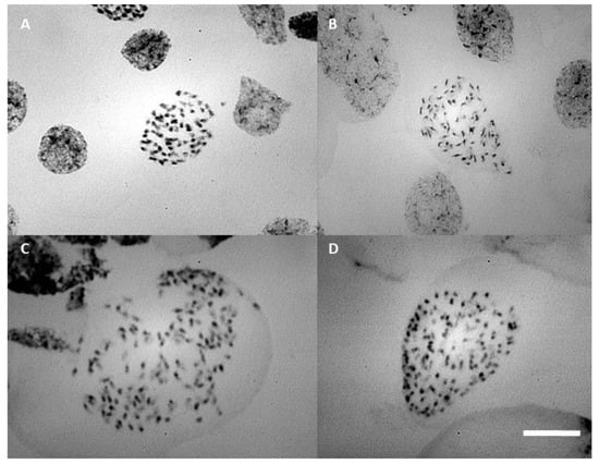 Prometaphase chromosome: (A) progeny of Blc. Haw Yuan Beauty × Blc. Goldenzelle “LC” without colchicine treatment; (B) Blc. Haw Yuan Beauty; (C,D) progeny of Blc. Haw Yuan Beauty × Blc. Goldenzelle “LC” treated with colchicine. Scale bar = 10 μm.