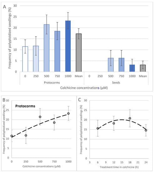 In orchids, such as Bletilla striata, the treatment with the highest concentration of colchicine and longer exposure time (0.4% colchicine for 9 days) resulted in the lowest seed germination rate [25]. Chung et al. [13] also induced polyploidy using hybrid seeds of Calanthe (C. discolor × C. sieboldii) (Orchidaceae) and reported a slight gradual decrease in seed germination as a consequence of increasing concentration and exposure time of seeds to colchicine or oryzalin.