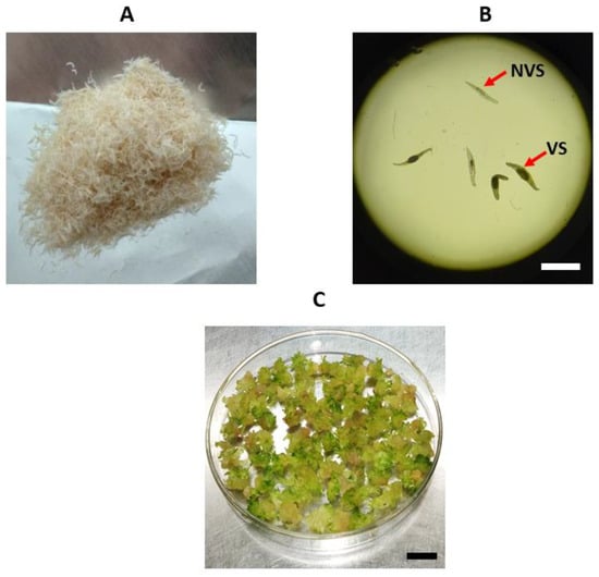Types of explants used for polyploidy induction: (A) macroscopic view of the seeds; (B) microscopic view (×40) of viable seeds (VS) containing embryos and non-viable seeds (NVS); (C) protocorms used in colchicine treatments. Scale bar = 1mm (B) and Scale bar = 1 cm (C).