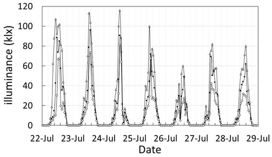 Measurement record of illuminance for one week from 22 July in the three-layer cultivation system. Symbols, △: Top, ●: Min, 〇: Bin.