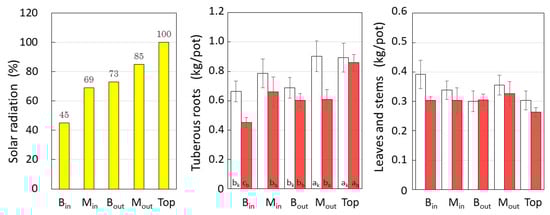 The amount of solar radiation in each layer, and the fresh weight of tuberous roots, leaves, and stems per pot harvested in each layer. Symbols: □: Suikenkintoki, ■: Beniharuka. Data are means and error bars represent standard error of the mean. Different letters indicate statistically significant differences between cultivation layers (p < 0.05).