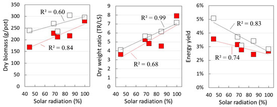 Dry biomass weight per pot, the dry weight ratio of tuberous roots (TR) to leaves and stems (LS), and energy yield, in each solar radiation rate. Symbols: □: Suikenkintoki, ■: Beniharuka. The data are the mean values, the dotted lines are the approximate lines determined by the least-squares method, and R2 is the coefficient of determination of the approximate line, indicating the degree of correlation between each element.
