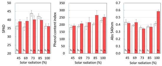 Figure 4 shows the chlorophyll content (SPAD), total phenolic content index, and absorbance at 540 nm of leaf extract at each level of solar radiation. In both cultivars, it was revealed that the chlorophyll content reached a maximum in Bout and the top layer decreased. In contrast, the phenol content increased with higher solar radiation.