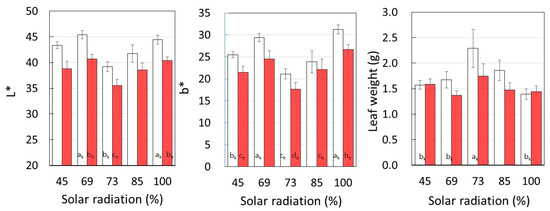 Leaf surface lightness (L*) and yellowness (b*) in each solar radiation, and individual leaf weight. □: Suikenkintoki, ■: Beniharuka. Data are the means and error bars represent standard error of the mean. Different letters indicate statistically significant differences between cultivation layers (p < 0.05).