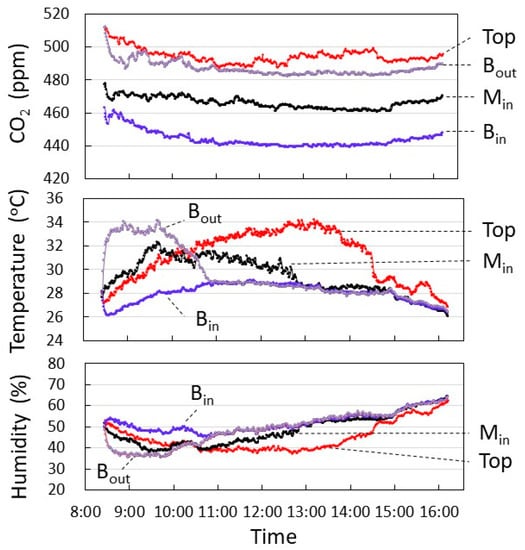 Figure 6 shows the CO2 concentration, temperature, and humidity of each layer measured in September. Data on clear days from 24–29 September were averaged to show the time changes. CO2 concentration at Bout was maintained within 15 ppm of Top, while the inside Min was 30 to 40 ppm lower than Top, and Bin was a further 20 ppm lower.