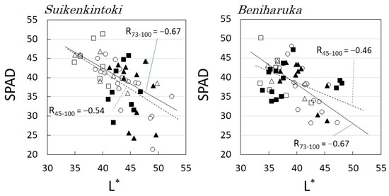 Relationships between leaf lightness (L*) and chlorophyll content (SPAD) in each solar radiation rate. Symbols: 〇: Top (SR = 100%), △: Mout (85%), □: Bout (73%), ▲: Min (69%), and ■: Bin (45%). The approximate lines were determined by the least-squares method, and R45–100 denotes the correlation coefficient for all data, and R73–100 denotes the correlation coefficient for data excluding Min and Bin.