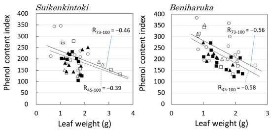 Leaf weight and polyphenol content. Symbols are the same as in Figure 7. The approximate lines were determined by the least-squares method, R45–100 denotes the correlation coefficient for all data, and R73–100 denotes the correlation coefficient for data excluding Min and Bin.
