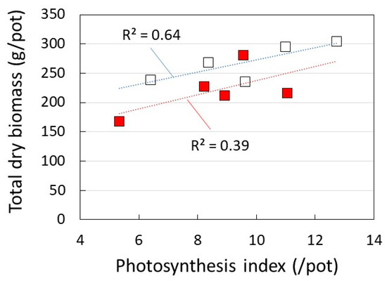 Relationship between the photosynthesis index [SPAD × leaves and stems (kg/pot) × solar radiation (%)] and total dry biomass production (tuberous roots, leaves and stems) in the three-layer cultivation of sweet potato. Symbols: □: Suikenkintoki, ■: Beniharuka.
