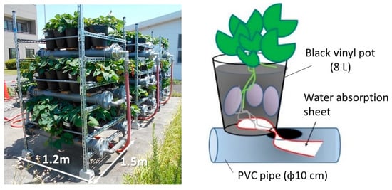 Using the method introduced in a previous paper [14,15], a water-absorbing sheet was inserted into the PVC pipe from the bottom of the pot and guided so that the thin roots of the sweet potatoes extended into the pipe containing water and liquid fertilizer.