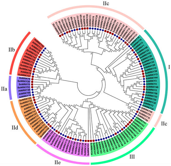 Combining 70 AtWRKY protein sequences with 59 SsWRKY protein sequences, MEGA7.0 software was employed to construct the phylogenetic tree and classify the sequences into three groups based on the features of the WRKY gene family in A. thaliana (Figure 1). Eleven SsWRKY proteins were classified into Group I, forty SsWRKY proteins were classified into Group II and were further divided into five subgroups, with 4, 5, 16, 7, and 8 members in subgroups IIa–IIe, respectively. Group III consisted of the remaining eight SsWRKY proteins.