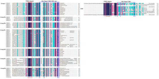 Multiple sequence alignments of the WRKY domain amino acid sequences of 59 SsWRKY proteins, visualized using the DNAMAN7.0 program. The highly conserved regions in each groups are shown in dark blue. The red lines represent the WRKY domains, and the blue lines indicate the conserved zinc finger motifs.